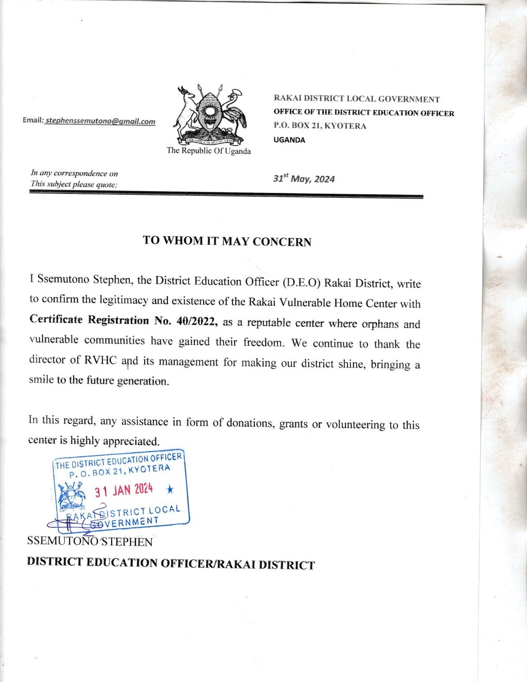 Endorsement by Rakai District Department of Education